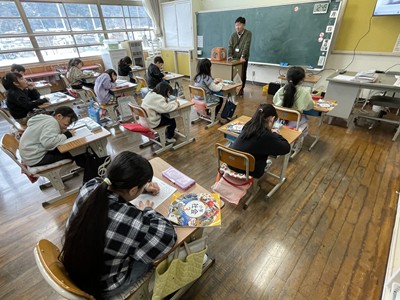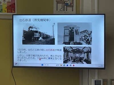 お話の中では、かつて出石から江原まで鉄道が通っていたことや、当時の服装、道路の様子などが紹介され、社会科で学習した内容を、実際の写真を通してより深く理解することができました。