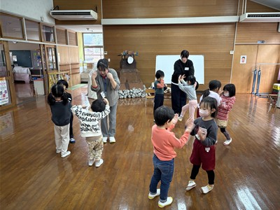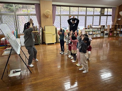 1月14日に幼稚園の子どもたちは、いつも英語でお世話になっているEMI(えみ)先生と一緒に「英語遊び」を実施しました。久しぶりの活動でしたが、友だちとペアになって大好きな“Hello
