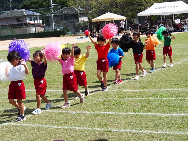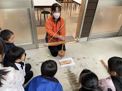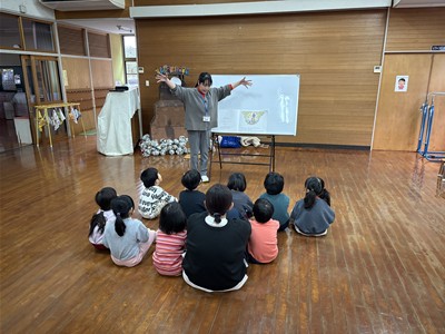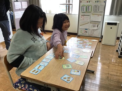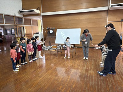 幼稚園で「えいご遊び」がありました。本校ALTのアリエル先生とEmi先生に来ていただき、楽しく「えいご」を使って活動しました。今回は英語で色を「レッド」「パープル」「オレンジ」「グリーン」「イエロー」「ブルー」「ホワイト」と表現する活動からスタートし、次に全体を使って「ヘッド、ショルダーズ、ニーズ、アンド、トウズ」と歌いながら頭からつま先までを順番に触っていくという活動もしました。そしてアリエル先生に英語の絵本の読み聞かせをしてもらいました。アリエル先生との「えいご遊び」は今回で最後となります。子どもたちはお礼の手紙を画用紙に準備していて、アリエル先生に渡しました。
