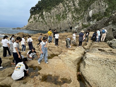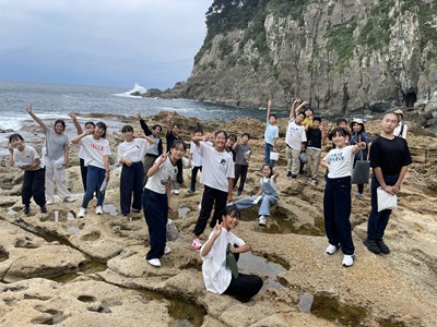 玄武洞では、規則正しく並んだ柱状節理の岩壁に圧倒され、自然の力の大きさを実感していました。竹野海岸では、海食崖や入り組んだ海岸線など、山陰海岸ならではの地形に触れ、地球の歴史が身近に感じられる学習となりました。6年生にとって、地球の成り立ちや自然環境と人々の生活との関わりを考える貴重な学習となりました。