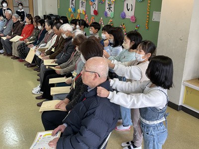 当日は、児童会長のお礼の言葉から始まり、来校いただいた皆様の自己紹介、5・6年生による感謝状の贈呈、全校生での「ありがとうの花」の合唱、1・2年生の肩たたき、3・4年生手作りのメダルのプレゼントなど、心のこもったプログラムが続きました。会場は終始温かな雰囲気に包まれ、子どもたちの思いがしっかりと届くひとときとなりました。