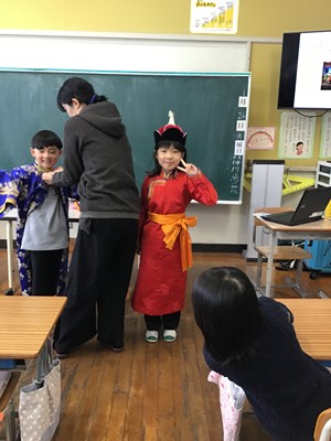 物語の学習を終えた今、子どもたちは登場人物の思いや場面の様子を、より具体的に思い描きながら読み進めることができたことを実感しています。出前授業での体験が、物語の理解を深める大きな助けとなりました。また、モンゴルの伝統衣装を着る体験もあり、子どもたちは笑顔いっぱいで活動していました。遠く離れたモンゴルの文化や歴史を身近に感じることができた、貴重で充実した学びの機会となりました。
