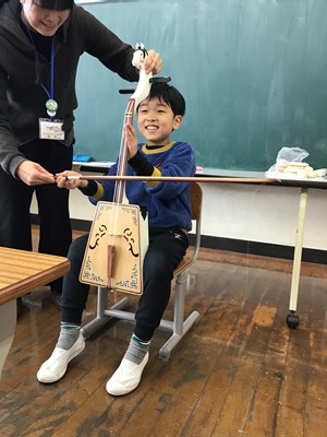 この出前授業は、その後に学習した国語科「スーホの白い馬」へとつながる学びの時間となりました。授業では、モンゴルの生活の様子や文化、伝統的な弦楽器である馬頭琴について教えていただき、実際にその音色を聴いたり、楽器に触れさせていただいたりしました。