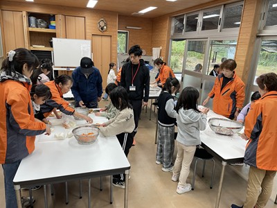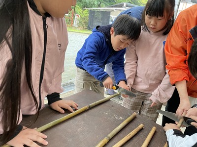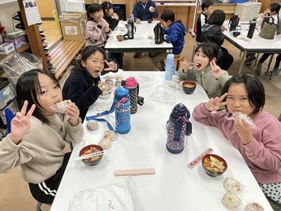また、自分たちで握ったおにぎりや、野菜を切って作った豚汁、蒸したサツマイモをおいしそうに味わう姿も印象的でした。さらに、教えていただきながら挑戦した竹鉄砲づくりでは、思うように飛ばなくても試行錯誤を重ねながら、時間を忘れて夢中になって取り組んでいました。子どもたちにとって、自然と人との関わりを学ぶ貴重な機会となりました。