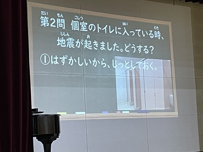 1月13日に行った追悼集会で、震災・学校支援チーム(EARTH)の方に来ていただき、阪神淡路大震災についてお話をしていただきました。地震が起こった当時の様子をふまえながら、防災に関わる「自分はどう行動すればよいのか」を、クイズ形式で分かりやすく教えていただき、「命を守ることの大切さ」について学ぶことができました。