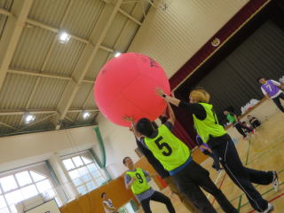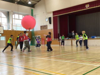 ![]() キンボールを通して、保護者や教職員同士の和が広がり、楽しいひとときを過ごすことができました。 |