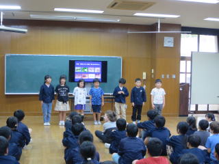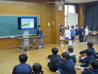 <2年生 学習発表会> 10月15日![]() 2年生の学習発表会が行われました。生活科で捕まえたり教室で飼ったりしている生き物のことをクイズを交えながら発表しました。 |
