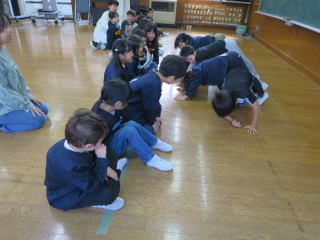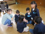 | <1・2年生 演劇ワークショップ> 10月27日 2学期になり、今年度2回目のワークショップです。この日学習は、2つのステップがありました。 1つ目は、5人程度に分かれたグループで、ジェスチャー形式のシーン創作を行うことです。 2つ目は、1つ目のステップで創作したシーンにくじで選んだ台詞を取り入れ、ジェスチャーをブラッシュアップしていくというものです。 子どもたちは、難しい課題にもグループで粘り強く話し合いや練習を続け、独創的で楽しいジェスチャーを考え、発表することができました。 この活動を通して、非認知能力(やり抜く力・自制心・協働性等)を育んでいきます。 |