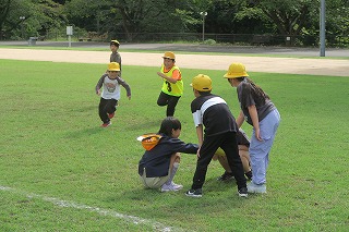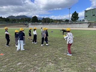 園小連携でみかたの森こども園のらいおん組の子どもたちが小学校へ来てくれました。昼休みに体育館で、児童会で考えた2種類のリレーを行いました。1つは、普通のリレーです。もう一つは、2人組で体のどこを使ってもいいので、ボールを落とさないように支え合いながらリレーをしました。体を使った遊びで、園の子どもたちと仲良くなれました。