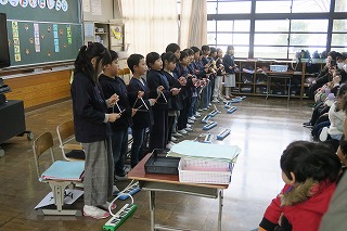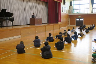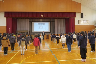 2学期が終了しました。校長より感謝について話をいたしました。給食の食器の返却で、子どもたちは、食器かごの食器をまっすぐ立ててくれています。これは、給食センターの方への感謝の気持ちの表れになります。日頃の生活の中で、何気ない行動にもしっかりとした意味があるという話でした。冬休みは、家族や親せきの方とゆったりと過ごしてください。