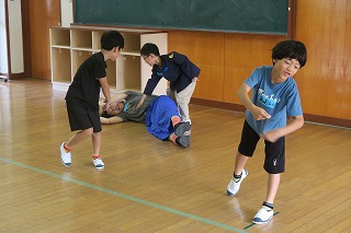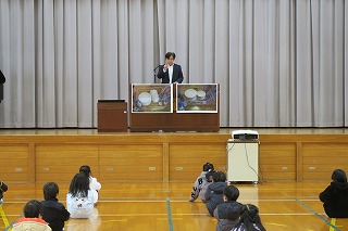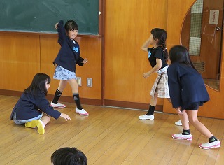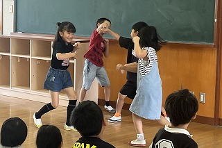 豊岡市からファシリテーターさんが来校し、1年生と2年生が別々の時間で演劇ワークショップを受けました。自分たちで話し合いオリジナルの劇を創り演じることで自己効力感(自信)、非認知能力(自制心、協働性、やり抜く力等)を高めることをねらっています。1年生は初めてですが、ファシリテーターさんが子どもたちの考えを上手くつなぎ劇を創り上げました。2年生は、昨年度からの積み上げがあり、話し合いのスムーズさや演じることへの場慣れができていました。1年生も2年生も表現力豊かに劇を創り演じました。
