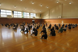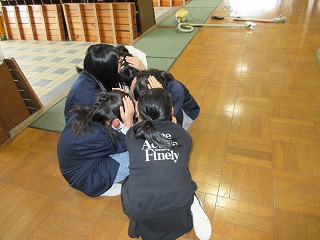 今回は、掃除の時間で、教師が指示を出せない状況でした。しかし、自分たちで考えて身を守る行動をとることができました。全員無事避難し訓練を終了しました。