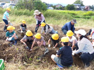 苗を植えて5か月、収穫の秋を迎えました。夏の暑さの影響でしょう、例年より収穫量が少なかったですが、それでも子どもたちは満足顔。1年から3年で力を合わせて秋の実りを手にしました