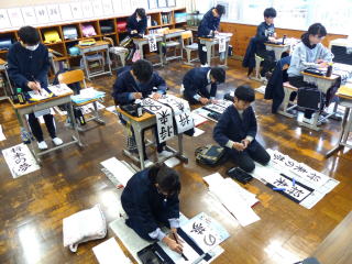 年のはじめにあたり、「春の海」のBGMに乗せて全校一斉に書初めを行いました。一年間の文字の上達を願いながらペンや筆を走らせる姿は、真剣そのもの。今年も多くの力作が誕生しました。
